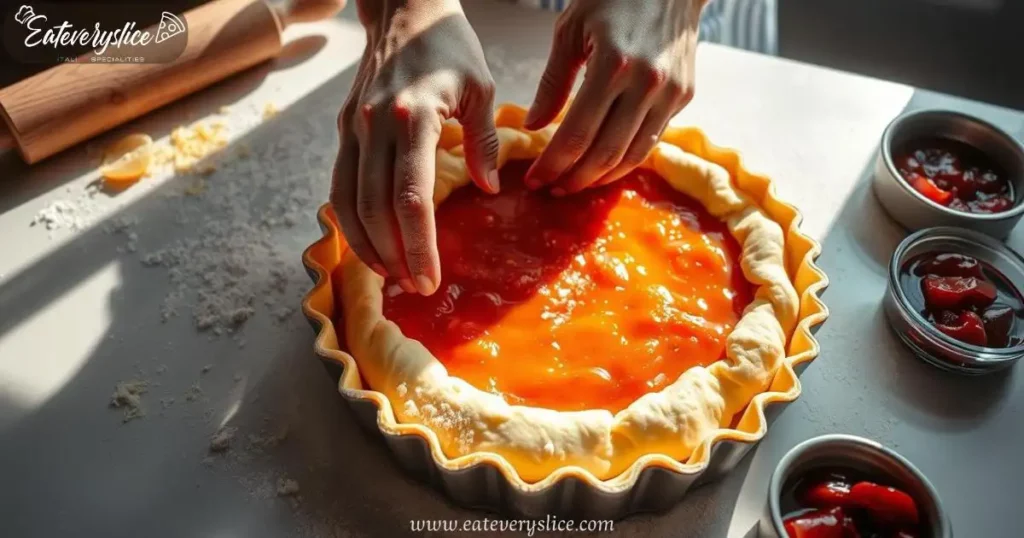 A sun-drenched kitchen counter with a classic crostata in the making, featuring golden pastry, marmellata filling, and fresh lemon zest, with flour-dusted hands shaping the dough.
