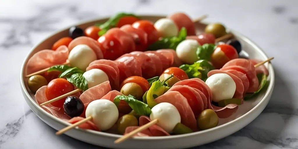 Antipasto skewers platter is a delightful Italian appetizer, ideal for parties. Featuring a mix of meats, cheeses, and vegetables, it's both easy to prepare and a hit at gatherings.