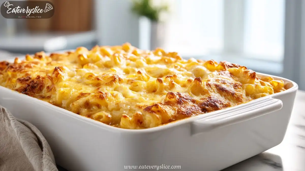 Golden-baked macaroni and cheese in a white ceramic dish, fresh from the oven