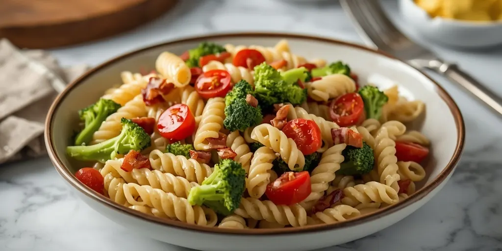 A delicious and healthy pasta salad featuring broccoli, turkey bacon, and a tangy dressing, perfect for potlucks and cold dinners.