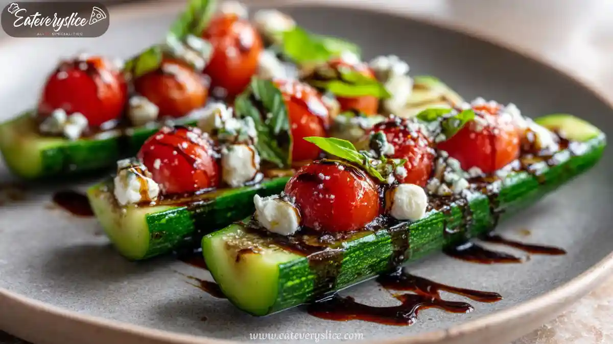 Crisp cucumber boats filled with cherry tomatoes, basil, and light mozzarella, finished with a balsamic drizzle. A fresh, no-cook American Italian snack that is perfect for healthy munchies cravings.