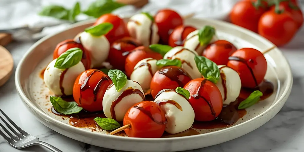 A vibrant Caprese Skewers Platter perfect for parties, featuring tomatoes, mozzarella, and basil drizzled with olive oil and balsamic glaze.