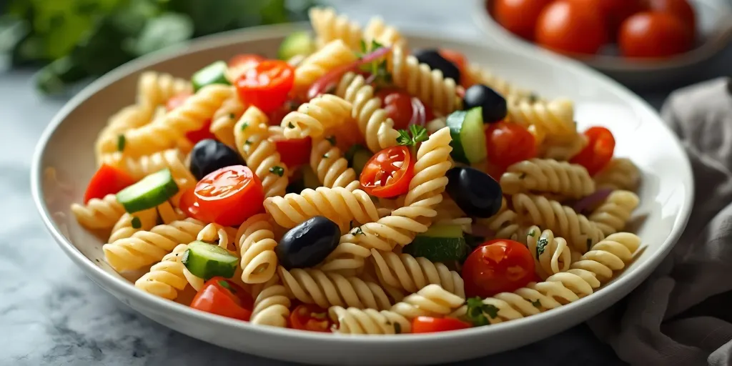 Pro Tips: Make the pasta salad a day ahead to enhance the flavors. Use a variety of vegetables for different textures. Ingredient Substitutions: Use gluten-free pasta if needed. How to Serve: Serve chilled with a side of bread. Storage & Freshness: Store in an airtight container in the refrigerator for up to 3 days. Make-Ahead Tips: Prepare the salad and dressing separately; combine just before serving for the best texture.