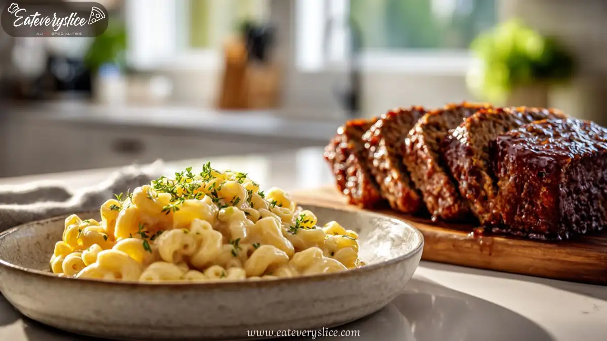 Keyword comfort style meatloaf, creamy macaroni side, family comfort dinner, meatloaf with macaroni