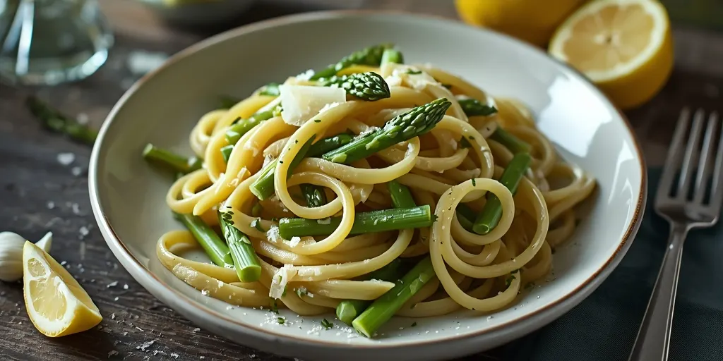 A refreshing and light Italian pasta dish that combines gemelli pasta with fresh asparagus and a zesty lemon sauce.