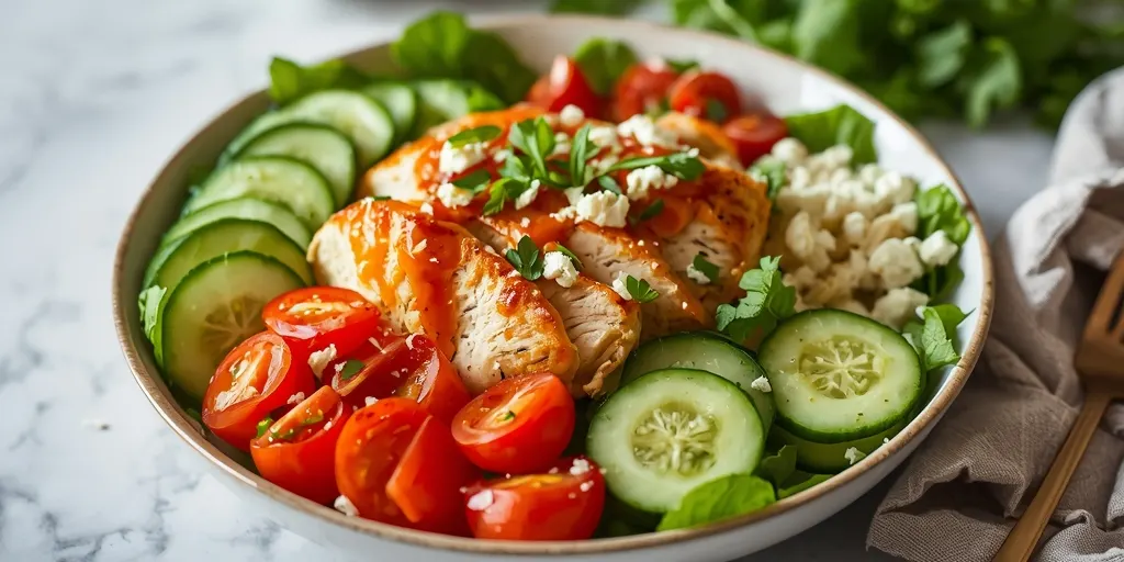 A vibrant and healthy Greek chicken salad bowl that's perfect for meal prep or a quick snack. It combines fresh vegetables, savory chicken, and a zesty Greek dressing.