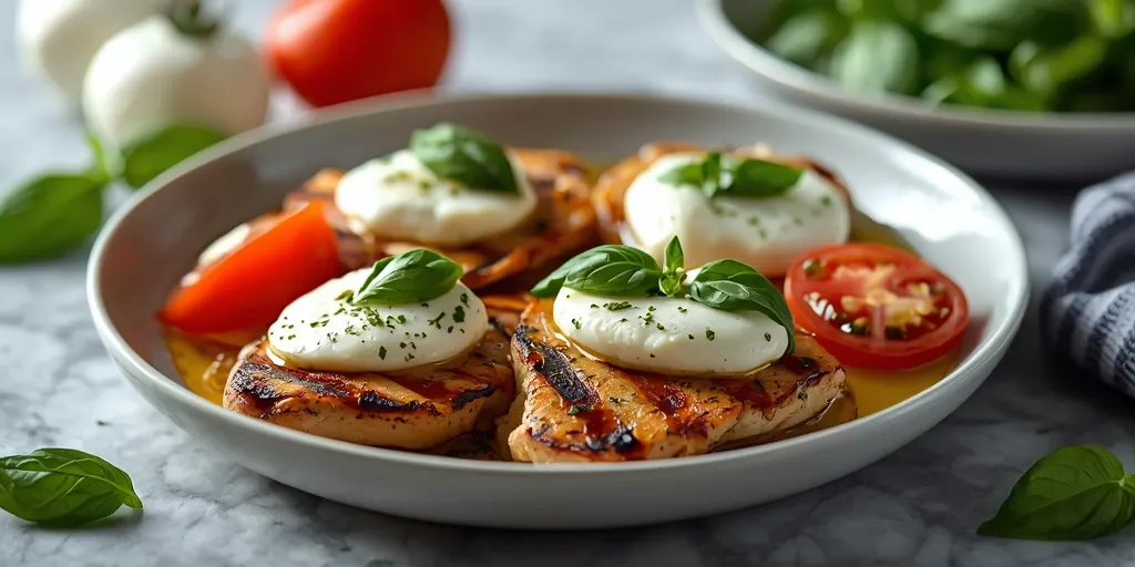 A delightful combination of grilled chicken, fresh tomatoes, mozzarella, and basil, perfect for a healthy and flavorful BBQ meal.
