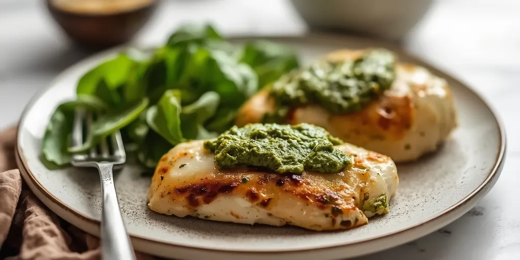 A delicious and nutritious low carb, high protein dinner featuring tender chicken breasts topped with a homemade pesto sauce.