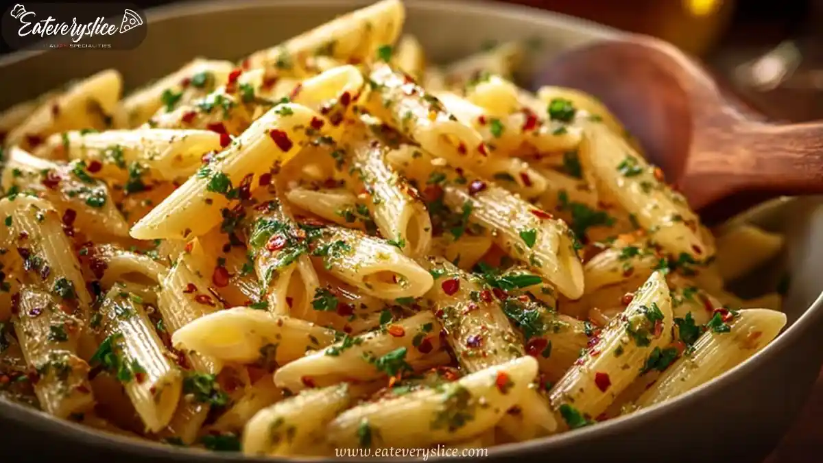 A delightful dish featuring spaghetti tossed in golden olive oil and sautéed garlic, complemented by red pepper flakes and fresh parsley.