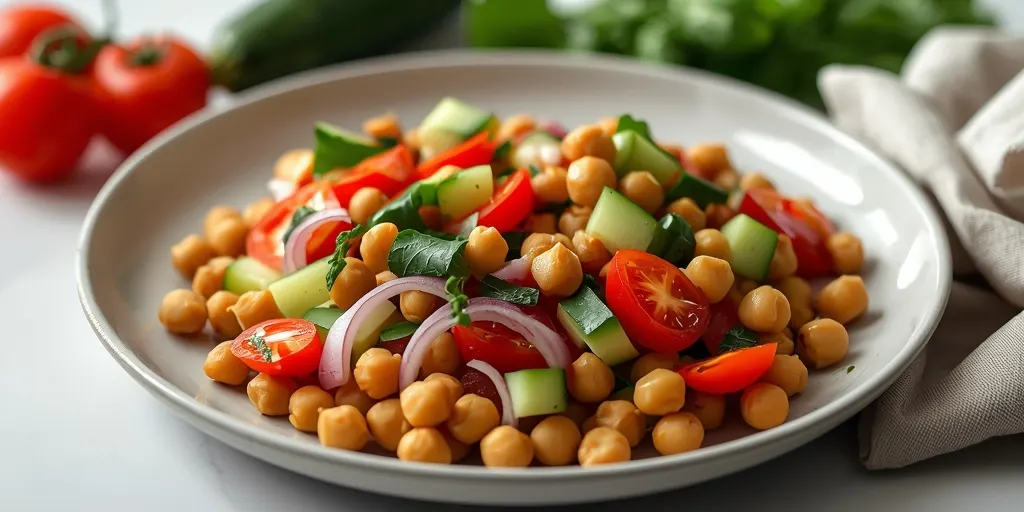 A zesty and nutritious Mediterranean Chickpea Salad perfect for meal prep. Packed with fresh vegetables and a flavorful dressing, it's an ideal choice for quick and healthy meals.