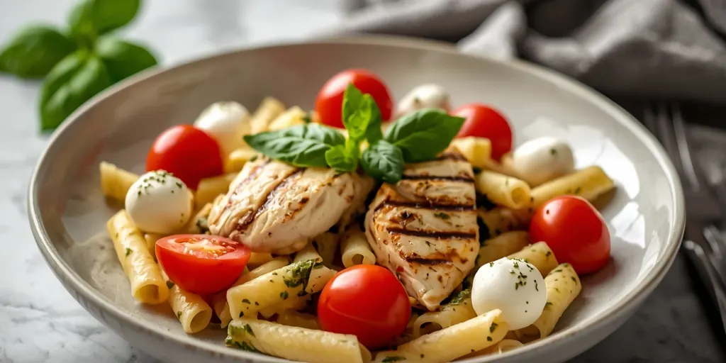 A delightful blend of grilled chicken, basil pesto, and pasta that is perfect for cold pasta dinners or as a refreshing side dish.
