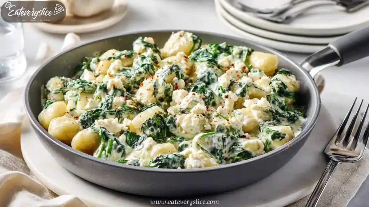 Creamy spinach and feta gnocchi skillet made in one pan for a comforting and easy vegetarian dinner.