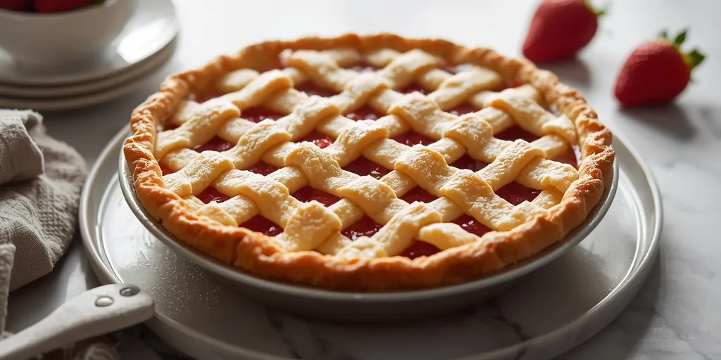 A delightful homemade strawberry lattice pie with fresh ingredients and a beautiful crust.