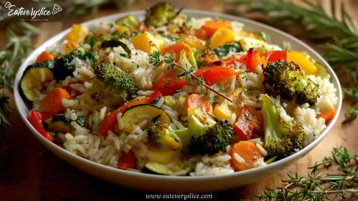 Vegetarian roasted vegetable rice bowls with caramelized vegetables, fluffy rice, and simple seasonings for a comforting and satisfying dinner.